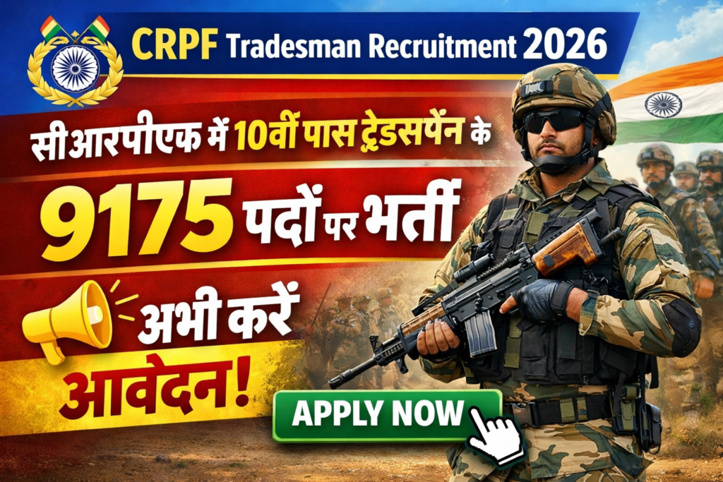 CRPF Tradesman Recruitment 2026: केंद्रीय रिजर्व पुलिस बल ने ट्रेड्समैन के 9175 पदों पर भर्ती का नोटिफिकेशन जारी कर दिया है इसके लिए 10वीं पास महिला और पुरुष अभ्यर्थी ऑनलाइन मोड में आवेदन फॉर्म भर सकते हैं केंद्रीय रिजर्व पुलिस बल में तकनीकी एवं ट्रेड्समैन तथा पायनियर के रिक्त पदों पर भर्ती की जाएगी सीआरपीएफ कांस्टेबल ट्रेड्समैन भर्ती के लिए आवेदन 20 अप्रैल से लेकर 19 मई 2026 तक भरे जाएंगे।