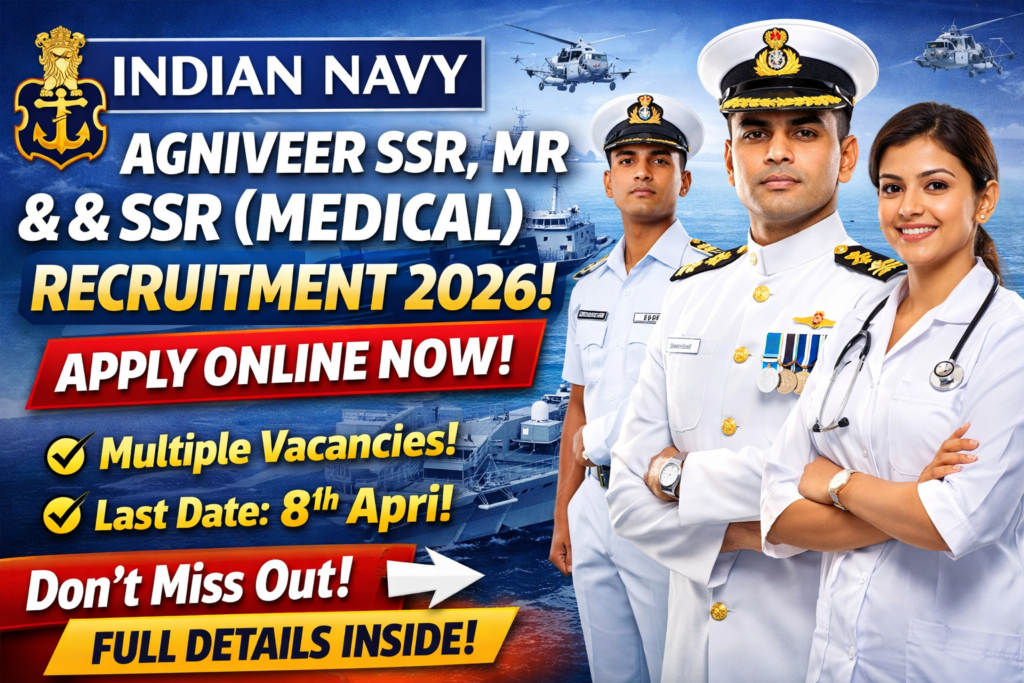 Indian Navy Agniveer SSR, MR & SSR (Medical) Recruitment 2026: Indian Navy Agniveer SSR, MR & SSR (Medical) Recruitment 2026 notification has been released for candidates who want to join the Indian Navy under the Agnipath scheme. This recruitment includes posts such as Senior Secondary Recruit (SSR), Matric Recruit (MR), and SSR (Medical). Interested and eligible candidates can apply online through the official portal within the given application dates mentioned in the notification.